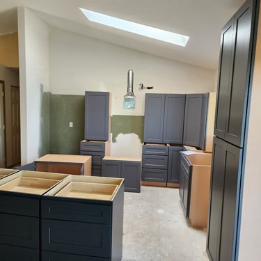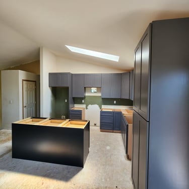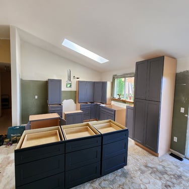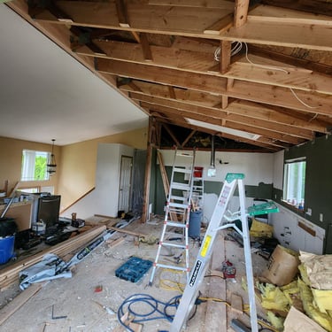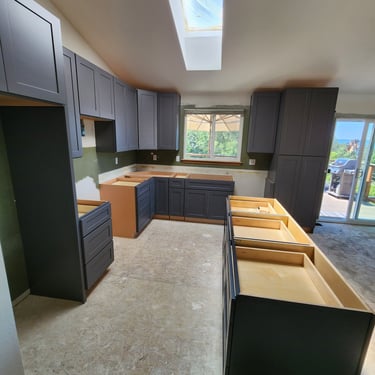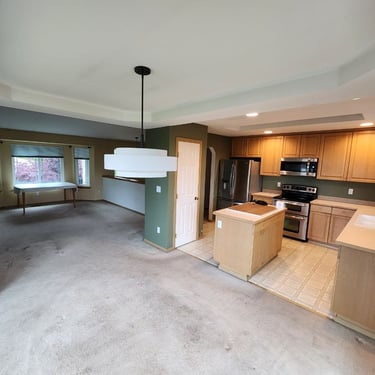 Transform your space with our expert hardwood floor and cabinet installation services, proudly serving the Bellevue area. We install premium hardwood floors and custom cabinets with precision, as seen in this inviting Bellevue kitchen and living area, blending natural wood tones with functional elegance.