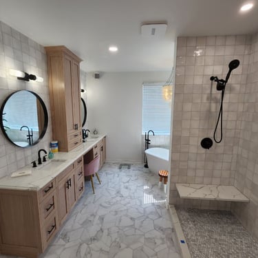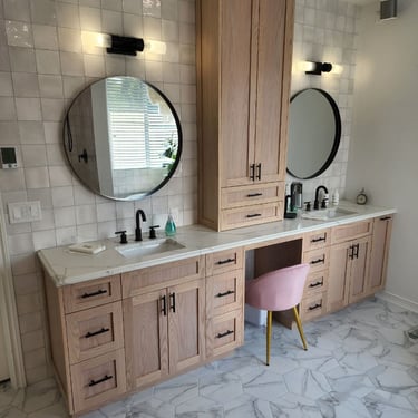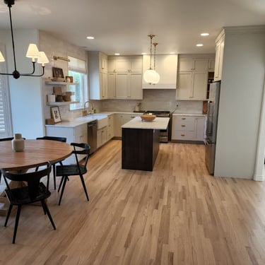 Experience the perfect blend of craftsmanship and creativity with our hardwood floor installation and collaborative design services. This Mukilteo kitchen and dining area features custom hardwood floors and cabinetry, designed in partnership with the homeowners to create a warm, modern space.
