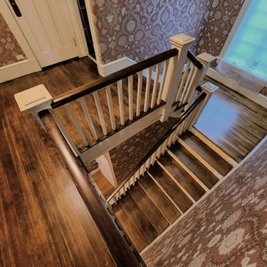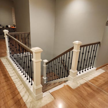 Enhance your home with custom interior stairs. This elegant Kirkland staircase features rich hardwood treads and handrails paired with ornate black balusters, showcasing our precision craftsmanship and timeless design.