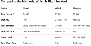 What Are the Best Installation Methods for Hardwood Flooring: Glued, Nailed, Floating?
